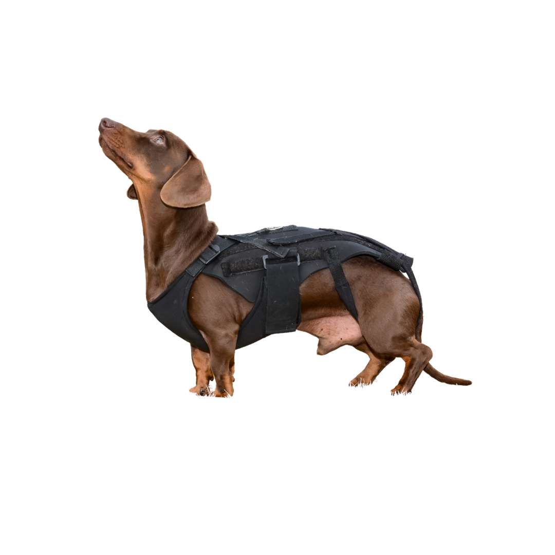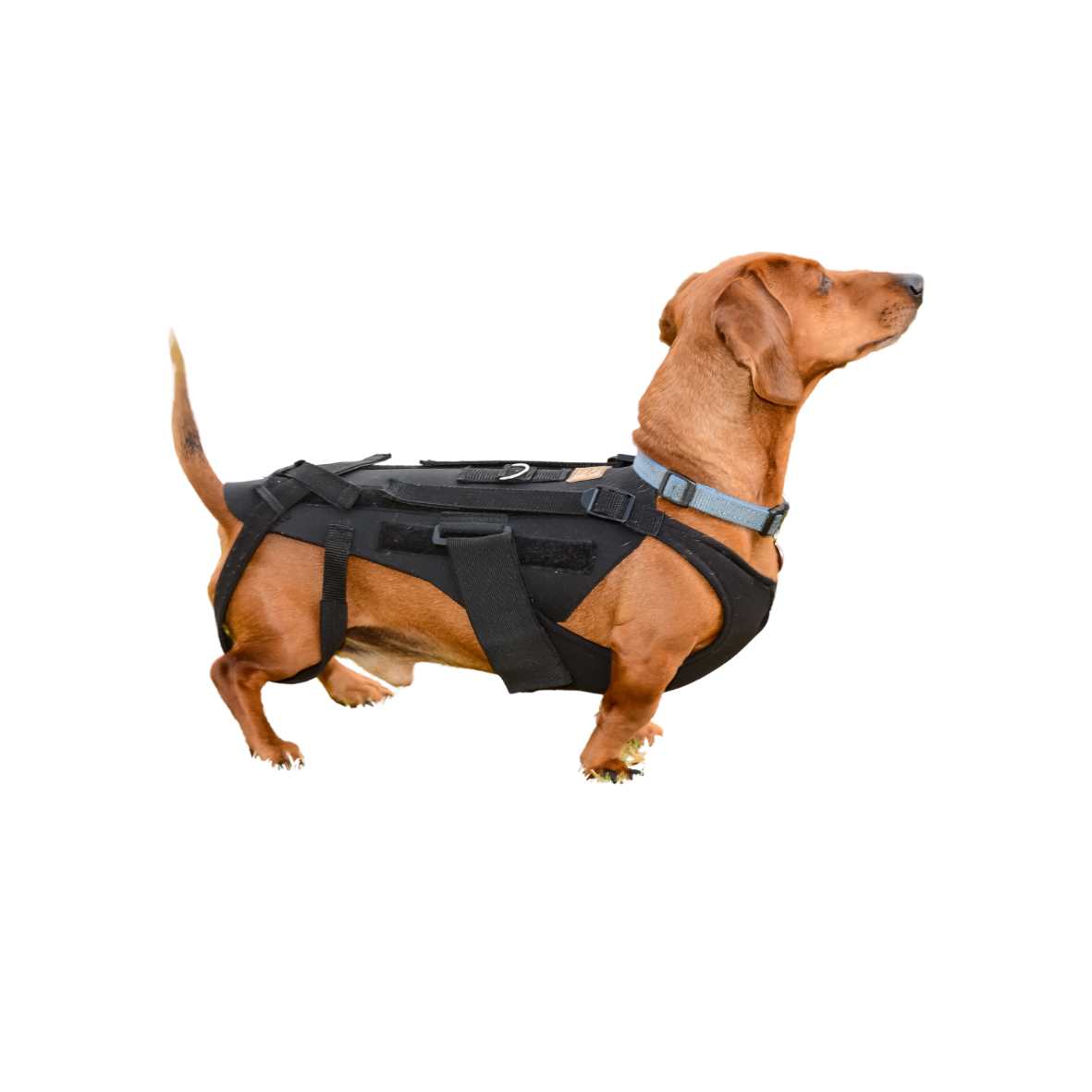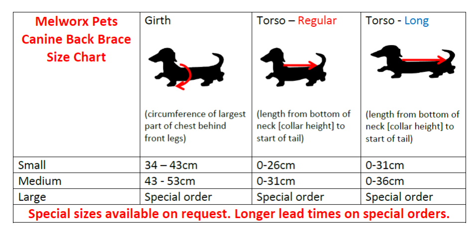 The Melworx Pets Canine Back Brace is specifically designed with veterinarian input for the support in treatment processes and possible prevention of IVDD(Intervertebral Disc Disease) or other problems of the back/spine. The brace gives support to the spinal column of the dog with a snug fit and aluminium support on both sides. The brace is fully adjustable for different breeds and sizes. The brace must be ordered according to girth and torso length. The dog has full mobility in the brace, but chooses not to jump due to the support of the brace.